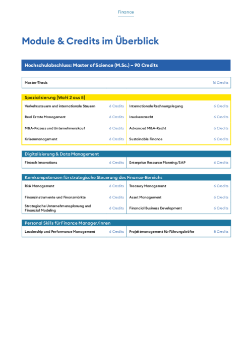 Richte dein Studium individuell auf deine Karriereziele aus, indem du zwei Spezialisierungen aus dem Bereich Finance wählst. Du hast die Möglichkeit, dich in folgenden Bereichen zu vertiefen: