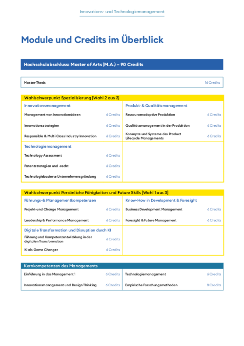 Ein besonderes Plus: Für den Master-Studiengang Innovations- & Technologiemanagement bieten wir auch eine Kurzversion mit 60 Credits an. Ideal für alle, die bereits ein Erststudium absolviert und umfangreiche Berufserfahrung in diesem Bereich haben!